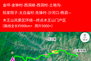 起点云盖寺镇-枫岩沟-葛条沟-周家沟-金坪-金钟村-西洞峡-西洞村-土地沟-阮家院子-太白庙村-先锋村-沙河口-杨泗—木王山风景区环绕—终点木王山门户区(全长90km+累计爬升5000+)
